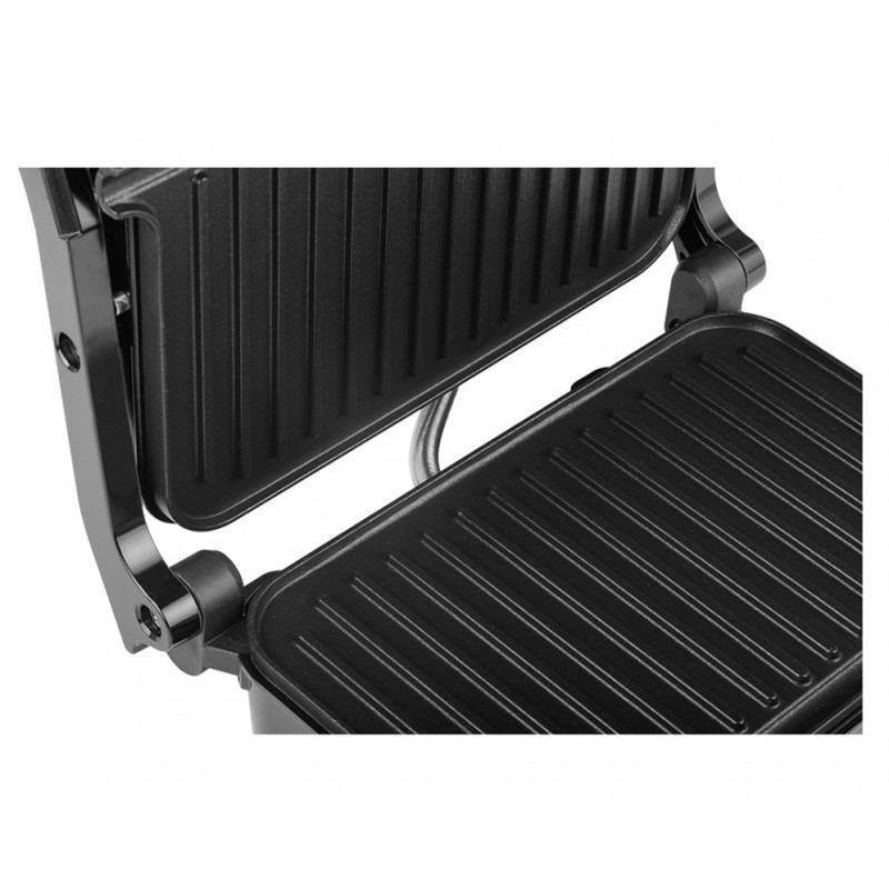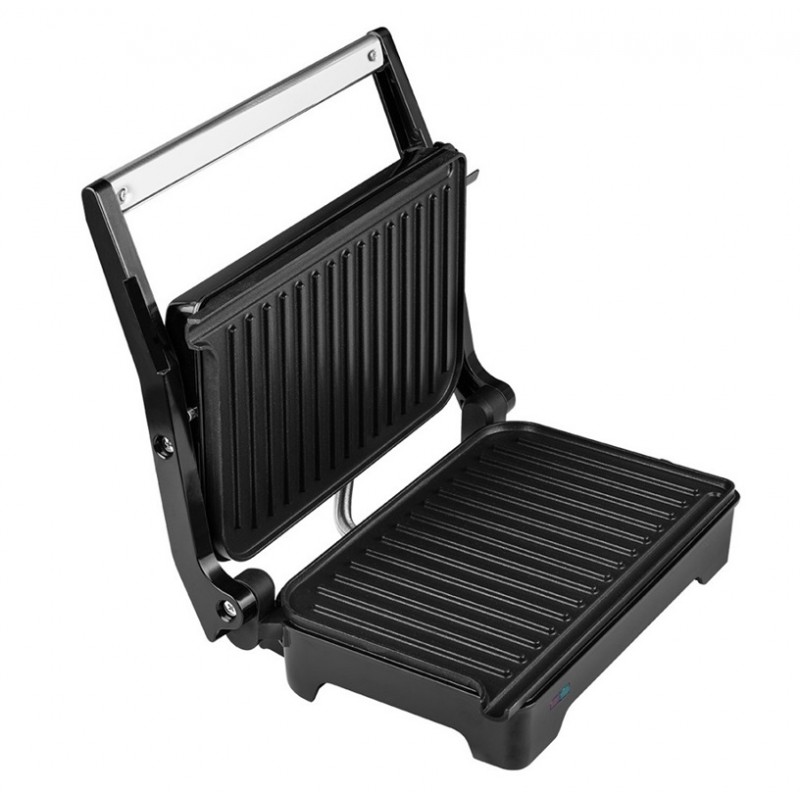 Pro přípravu panini, toustů i zeleniny, nepřilnavá povrchová úprava pečicích ploch (165*260mm), tepelně izolovaná rukojeť, světelný indikátor, příkon 1 200 W, možnost otevřít do BBQ polohy (180°), dvě odkapávací nádoby, možnost uzamknutí pro lepší manipulaci 10,9x29,6x26,5
