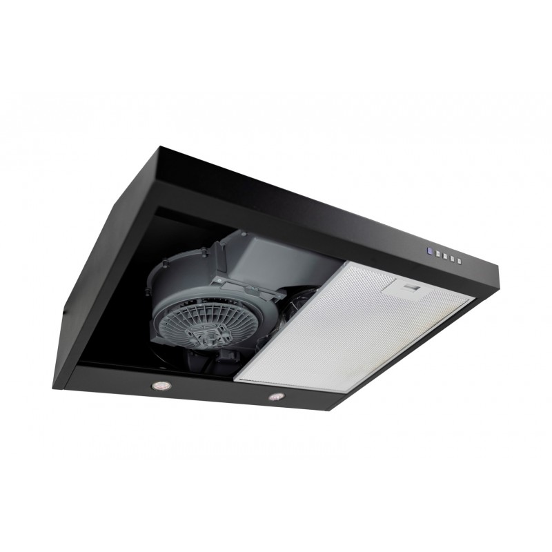 Podskříňková digestoř, šíře 50 cm, černá, max. výkon 286 m3/h (15 Pa), hlučnost Lw 55 – 74 dB(A), 3 rychlosti, elektronické tlačítkové ovládání, kovové sendvičové tukové filtry, které lze mýt v myčce, možnost práce v odtahovém i recirkulačním režimu, výstupní průměr 120 mm, Výbava: ovládání gestem - digestoř lze vypnout bezkontaktně pohybem ruky, dalším pohybem ji lze opět zapnout.