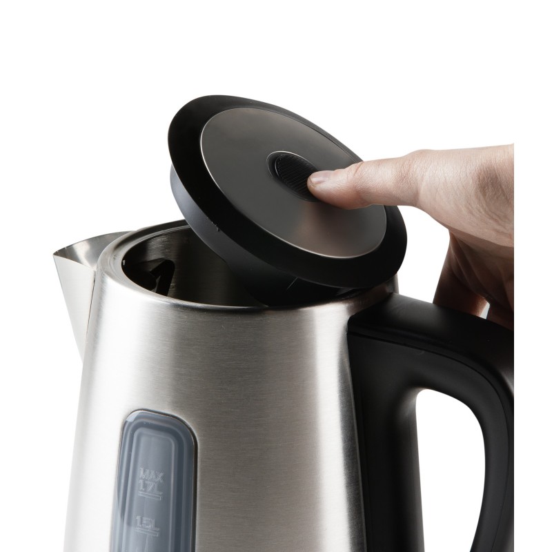 Nerezová rychlovarná konvice o objemu 1,7 l s bezpečnostním 360° konektorem STRIX. Vypnutí při varu, nebo sejmutí z podstavce. Velký vodoznak a ochrana proti chodu naprázdno.