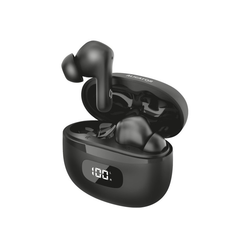 * Obsah balení: Bluetooth sluchátka Aligator Pods ANC, nabíjecí pouzdro s LED displejem, nabíjecí USB-C kabel, 3 velikosti náušníků, návod k použití